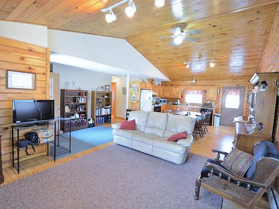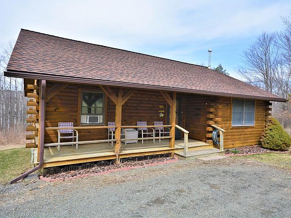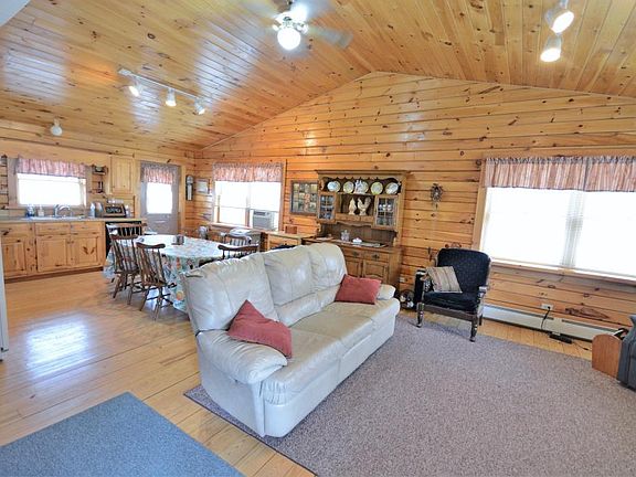 Quality 2 BR log home w/ detached 2 car garage sits on over 7 acres! The kitchen, dining & living spaces are combined in a lovely open floor plan under cathedral ceilings. The main floor also features 2 BRs and an updated BA. More space is provided in the lower, walk-out level w/ a large finished family room w/ possible office area. The LL also has a utility room for laundry, storage, etc. The roof & boiler were replaced approx 5 years ago. 2 car garage/workshop, quaint front porch, private back deck plus 7 acres of land will satisfy any outdoor lover. Must see in person to really appreciate!