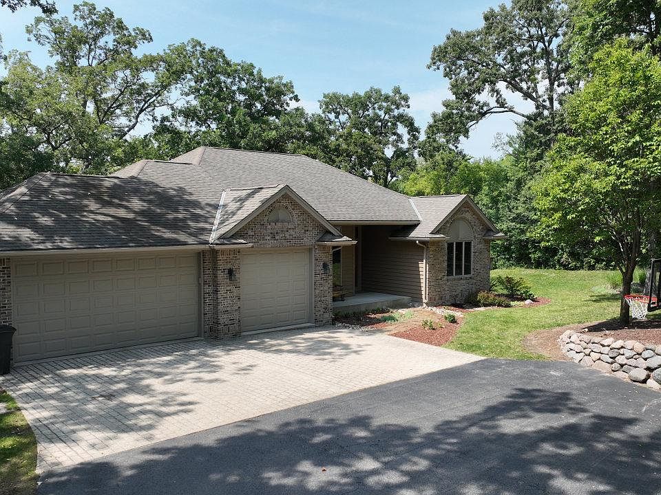 Absolutely stunning brick walk-out ranch facing western wooded vista views behind you. Step into the vaulted great room with a centered custom gas fireplace surrounded by large windows open to the kitchen and dining room areas. The kitchen will fulfill all your cooking needs featuring extensive granite counters, and ample cabinets with SS appliances and custom cabinets. The Primary ensuite offers a large WIC, huge spa-like bath, and more private views of mature Hardwood trees. The Lower level features a large recreation area, bedroom, bathroom, and office with heated floors. You will love the 3.5 car attached garage and also another 2 Story heated outbuilding/workshop.studio with a walkout storage area below it. The expansive composite deck is ideal for all your outdoor entertaining.