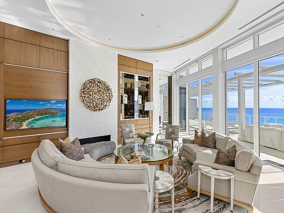 The Sky Penthouse at One Thousand Ocean in Boca Raton is a rare and exceptional residence, blending architectural grandeur with unparalleled luxury. Conceived by Garcia Stromberg Architecture, masterfully executed by Cudmore Builders, and elegantly curated by Shuster Design Studio, this breathtaking penthouse spans 9,303 total square feet, with 6,037 square feet under air. Offering the most extraordinary panoramic views in Boca Raton, the Sky Penthouse boasts unobstructed vistas of the Atlantic Ocean to the east and the Intracoastal Waterway to the west, framing the landscape with breathtaking natural beauty. Bathed in an abundance of natural light, the penthouse features soaring 14' ceilings that enhance the sense of space and openness. Luxurious wood paneling, marble and rich hardwood flooring seamlessly integrate throughout, creating an atmosphere of refined elegance. Floor-to-ceiling sliding glass doors invite sunlight in while providing uninterrupted views of the surrounding coastal splendor, further connecting the interior to the stunning environment outside.