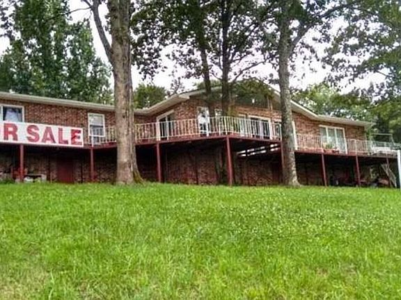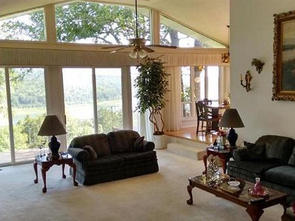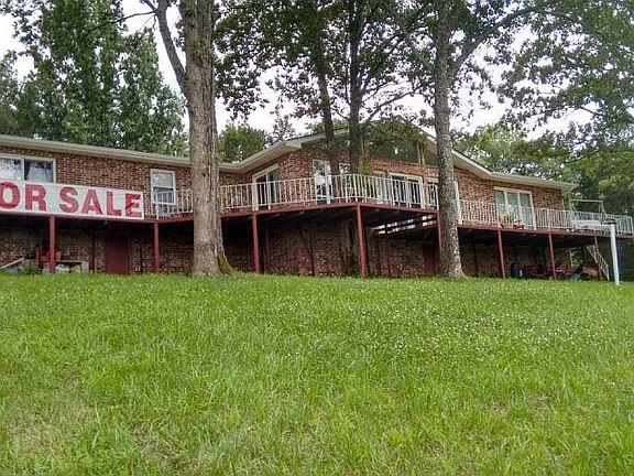 AWAKE TO THE TRANQUIL VIEW OF BULL SHOALS LAKE- where you can walk to water to fish and hunt on your private 10 ac m/l. All brick, 2500 sq ft, 3/2/2 car garage, split bedroom, separate dining area, lake views from most rooms. A 50' cement deck leading to 36'x45' recreation house. All this and only 7 minutes to shopping, 1.5 mile to public boat launch area. Possible owner finance on down payment.
