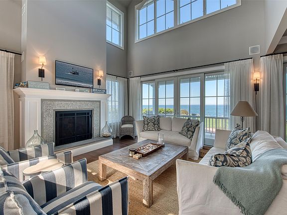 Immaculate shingle-style home perched above the Long Island Sound. Enjoy endless water views and breathtaking sunsets from the heated pool and private beach. Open floor plan with EIK and fireplace, bedrooms across three floors, including first and second-floor primary suites with private waterside balconies. The large finished basement features a media/game room. The private office is ideal for remote work and has a third private waterside balcony-prime indoor/outdoor summer living just a mile from Greenport Village's shops and restaurants. Personal property manager to address any tenant needs. Hamptons luxury with North Fork vibes. Two-week minimum. Local boat slip included with monthly rental, inquire for details.