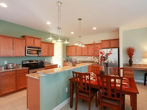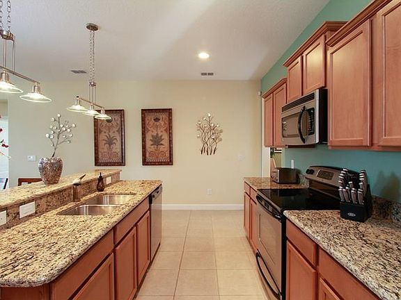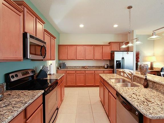 Shows like a new builder's model with professionally decorated and designed interior at a fraction of a new build price. Plus with this home, you actually get to keep the beautiful high end furniture, accents and other contents which make it a true turn key vacation paradise! Entertain in style with the spacious, sophisticated formal living and dining rooms and for those more casual affairs, the huge family room/ kitchen combo will fit the bill. With an abundance of gorgeous granite counter space, the kitchen is perfect for preparing tasty meals while guests casually gather round the breakfast bar and well appointed kitchen table. During those hot summer months you'll love cooling off in your sparkling pool or grab a lounger and relax in the shade. Enjoy warm evenings out on your covered lanai or feel the stress melt away in your personal hot tub, all the while taking in tranquil pool and wooded views. End your day the perfect way in the luxurious master retreat with beautiful ensuite bathroom. This home has upgrades too many to mention and truthfully needs to be seen to be fully appreciated. Situated in an exquisitely maintained gated community boasting a clubhouse with a resort-style pool, fitness center, tennis courts and sand volleyball courts, the home is minutes from Disney, major roads, other theme parks, shopping and dining. HOA fees conveniently cover private lawn and plant care along with cable. Investors will love the short term rental zoning and realtors can bring their most discerning buyers!