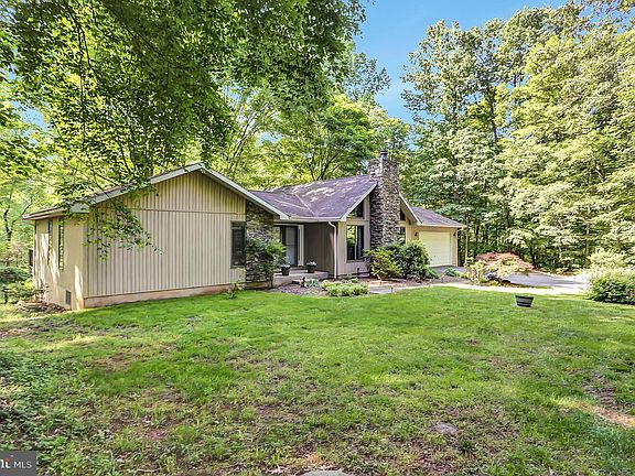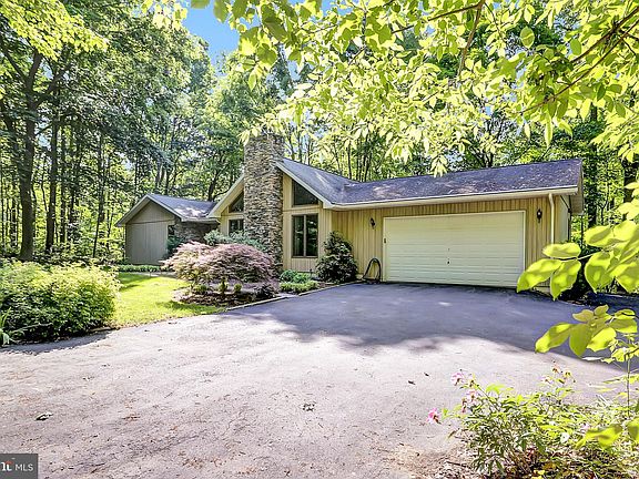 If privacy is what you are looking for, then Welcome Home to this dream retreat nestled on 18.5 picturesque wooded acres located just outside the quaint town of Lewisberry - where nature's beauty meets modern comfort. This lovely chalet-style ranch home sits back from the road and features 3 bedrooms and 1 full and 1 half bath with 1,610 square feet of thoughtfully designed living space. The spacious living room boasts a vaulted ceiling with large windows that let in tons of natural light and a cozy stone fireplace for those chilly fall/winter evenings. There is a formal dining room with wood floors that flows into the kitchen with stainless steel appliances, an island and a breakfast/sitting area with access to the large rear deck and a pellet stove to keep everyone cozy and warm. A half bath is conveniently located off the kitchen beside the entrance to the oversized two-car garage. Back the hallway you will find the three bedrooms and a full bath with a tub/shower combination. The primary bedroom has sliding glass doors to the deck with amazing views of the trees, woodlands, and wildlife surrounding the home. Down the stairs you will find additional living space with a second kitchen, another pellet stove, storage rooms, laundry area and plenty of space that can flex with your individual needs - family room, additional dining room, playroom, office, gym area - the possibilities are endless. There is also a door to the outside from the lower level for added convenience. There is an outbuilding on the property that is perfect for storing all of your equipment and outdoor toys as well as a chicken coop with electric and a workshop with electric. You will have plenty of room to roam and enjoy the beauty of nature. Conveniently located about halfway between Harrisburg and York, this home is close to everything but crowded by nothing. Visit today and discover the lifestyle you have been dreaming of.