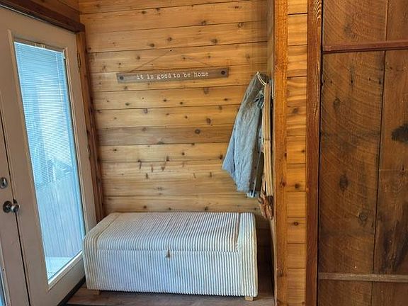 Entrance: Front entrance is through heated porch with thermopane windows. Living Room: Antique wooden floors, 2 cedar accent walls, other walls painted. Beamed ceiling between dining room and living room. Dining Room: Continuous decor with cedar walls, cove molding, one wall grey/white wainscot with farmhouse look, all open floor plan to living room, dining room, and kitchen. Kitchen: White cabinets, tan stone backsplash, tan granite-look laminate counter top. Appliances include gas 5 burner range with griddle, dishwasher, side by side refrigerator. Cedar walls, laminate floor, breakfast nook area has large window with live edge window ledge that overlooks raised wooden deck with treated wood and iron spindle railing. Bedroom: Wood floors, one feature wall of shiplap, other walls painted beautifully in repose grey with crown molding. Restful and peaceful! Bedroom: Repose grey painted walls, white trim, black ceiling fan. Oak flooring. Bath: Vinyl floor, white fixtures, white vanity, grey walls. UPSTAIRS: Master suite includes bedroom and full spacious bath (the bath is presently under construction). It will have white fixtures, grey wall, vinyl floor. The existing Master Bedroom has grey plush carpet, light grey walls, built in sconces by bed and above ceilings. Master bedroom has French patio doors opening up to an upper deck that faces east for morning sunlight! Basement: Dry basement has GFA and CAC, plus a new breaker box recently installed. Entire basement will be painted white by closing. Yard: Numerous trees for privacy and the yard area encompasses 4 city lots. Large all steel shop with water and sewer, led lighting overhead and two separate doors, facing south and north for convenient drive through. COMMERCIAL zoning for this house offers a multitude of business: auto repair shop, food service, even use the metal shed for parties! Your business plan awaits.