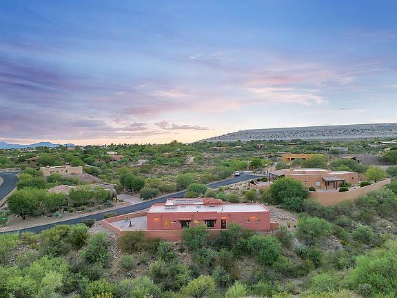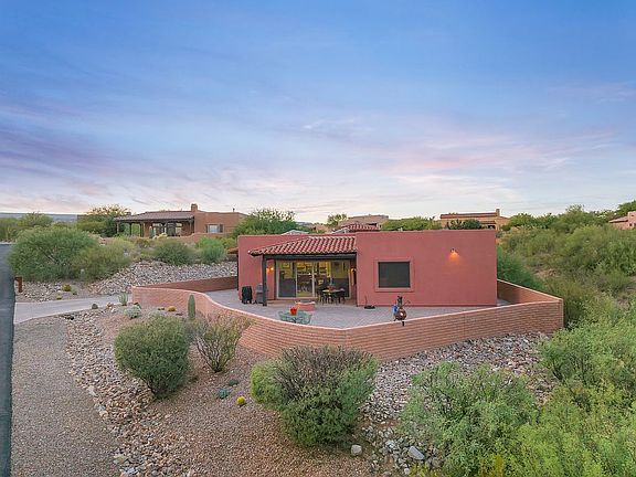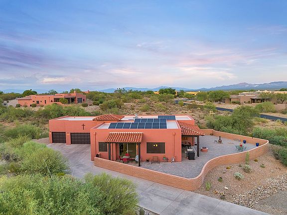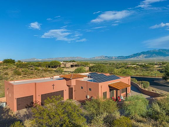 Overview Stunning Panoramic Views, Gas Beehive Fireplace, Large Paver Wraparound Courtyard, Solar, Spacious 3 Car Garage Embracing custom built, Santa Fe Style Dorn open floor plan designed home in the gated community of Alamos Estates. Home is situated to highlight the magnificent views of the Santa Rita mountains from both inside and outside. Upon entry into the foyer, you are greeted by breathtaking mountain views from the great room The great room is complemented by a charming beehive fireplace. There is also a beautiful mountain view from the master bedroom as well. The southwestern theme continues into the kitchen which is anchored by cedar hand-carved totem poles and features beautiful hickory cabinetry and quartz countertops. Solid wood Alder door to guest bedroom and Alder pocket doors complete the southwestern theme. The large paver wrap-around courtyard and covered patios are perfect for enjoying the gorgeous views, sunrises, sunsets, and outdoor living. A stuccoed gas fire-pit provides ambience and warmth on cool desert nights. The two covered patios have all-around electric and manual sunscreens which when lowered provide a screened-in porch effect for enjoying the outdoors as well as energy efficiency. The 3 car garage provides ample storage space and a walk-in closet. Don't miss this opportunity to own this property as one of the most reasonably priced available in this community, and a great value for a Buyer seeking both comfort, natural beauty, and maintenance ease. Most furnishings, except for select items, available through a separate bill of sale.