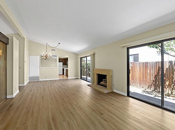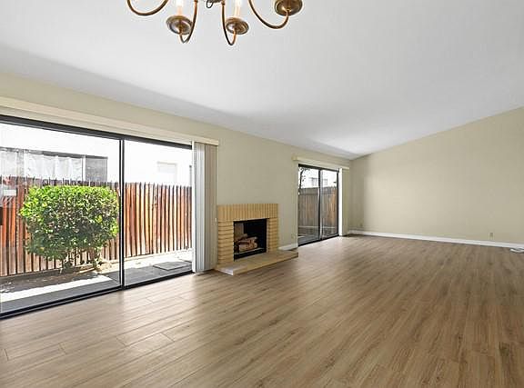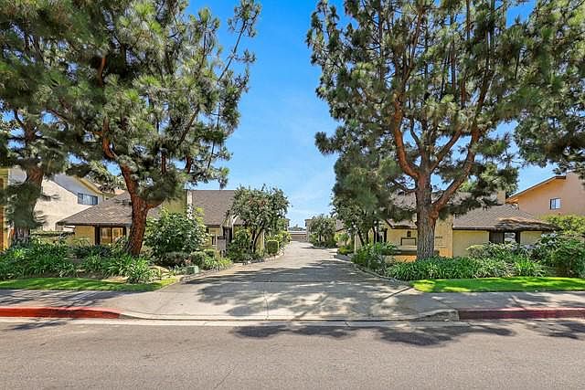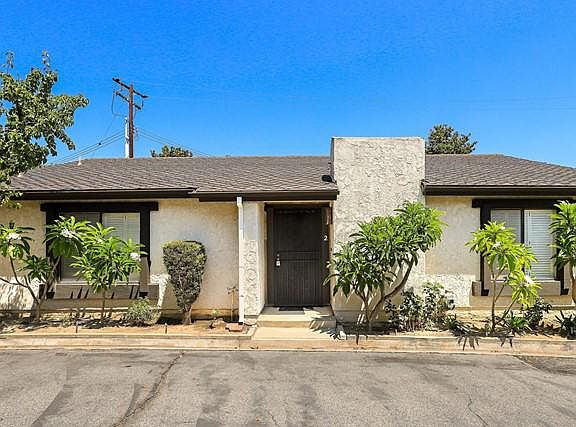 Rare find one-story building with newer wood-like floor and newly paint interior. Excellent floor plan, extremely clean and all rooms are bright and airy. Higher ceilings for living and dining with a fireplace. Sliding doors open to the rear yard. Large kitchen with eating area. Both bedrooms with large closet and plantation shutters. Refrigerator and washer & dryer included without warranty. Attached one car garage and additional one car detached garage each with 2 openers. Laundry hook-ups in the attached garage and lots of storage spaces. Within close proximity to markets, banks, restaurants and shops.