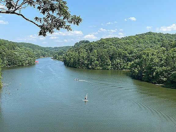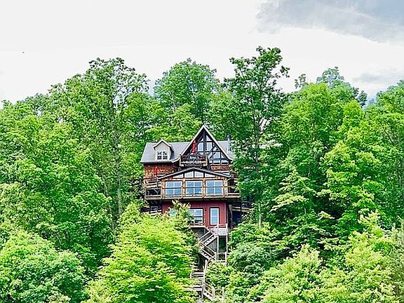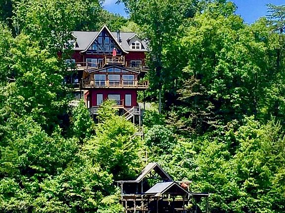 Gorgeous wooded lake front cabin with decks on all 3 levels of the home complete with a boathouse to fish off.