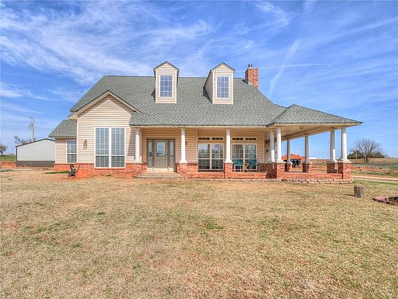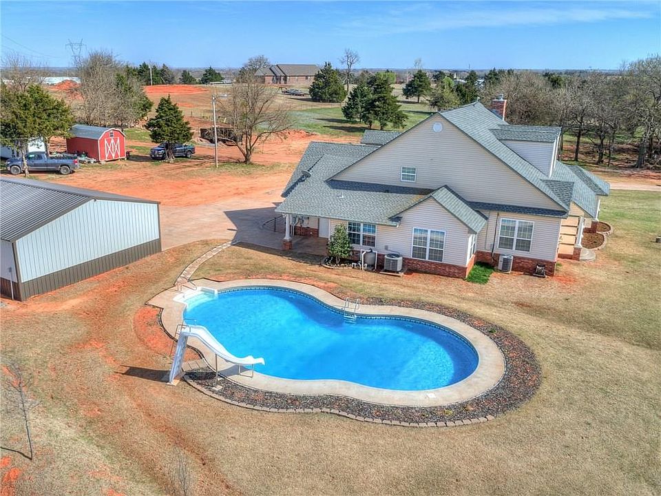 This incredible home sits on 11.45 agriculturally zoned acres with a stocked pond, 30x40 workshop w/ horse stalls and an inground pool, in MUSTANG SCHOOLS!! This private oasis boasts 6 bedrooms (or 5 plus a bonus room or 2nd living area), 3 full bathrooms and 2 dining areas. The master bedroom has its own private study, large walk-in closet and completely updated bathroom with a whirlpool tub. The kitchen has been completely remodeled, the interior has custom paint throughout, beautifully stained hardwood floors and more! The large wrap around porch is the perfect place to watch deer, geese and other wildlife, or simply enjoy a peaceful evening outside. It's almost summer time and the inground pool will be perfect for family gatherings, parties or to cool off from the summer heat. This truly is a home for a family to grow, have farm animals if desired and live a quiet country life while not being far from city amenities. Call and schedule your personal tour today!