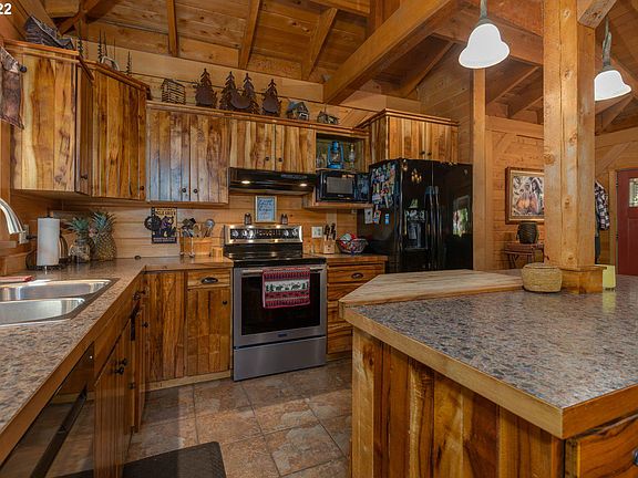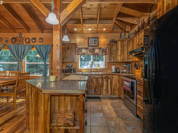 Your own secluded retreat surrounded by trees & creek. End of road privacy yet easy access to Hwy 42. Superbly crafted main residence featuring myrtlewood floors and vaulted beam ceiling. Island kitchen with quality newer appliances. A 24x32 shop building has a cozy upstairs studio apartment. Close by are 2 sleeping cabins plus a laundry/shower/restroom complex. Classic party barn is furnished in rustic decor; many of the antiques will stay. Also a 16x40 RV shelter. Cozy guest or craft room too.