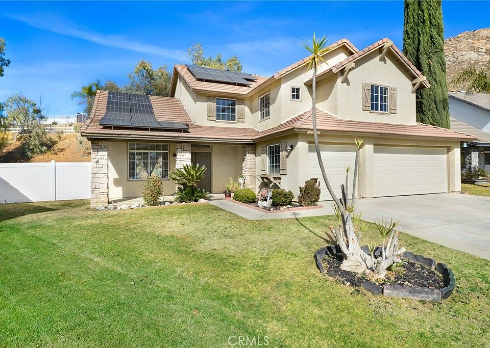 Welcome to 10001 Deep Canyon Rd, Moreno Valley, CA 92557! The home is situated in the Sunnymead Rancho community. This spacious 4-bedroom, 3-bathroom home offers 2,653 sq. ft. of living space on a generous 12,197 sq. ft. lot. Perfect for entertaining, the property features a sparkling in-ground pool and spa, a 3-car garage, leased solar panels for energy efficiency, and a downstairs bedroom and bathroom.