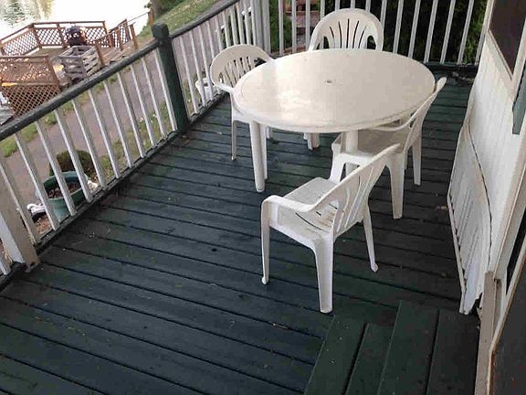 Waterfront!! Perfect summer home with relaxed up north feeling. Fully furnished, move in ready. Large bedroom and bathroom with tons of storage. Great deck overlooking lake for entertaining. 2 tiered dock on water. Gravel parking area with nice shed. Included electric golf cart. Enjoy swimming, boating, fishing, walking trail, bike path, tennis courts, basketball, volleyball and much more! Gated community. Condo fees paid yearly include electric and water.