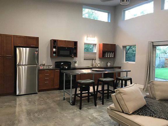 This stand alone guest house is modern and only 18 months old. Beautiful cream and grey concrete floors, 10' to15' ceilings. Quartz counters plus stainless island with seating. Picture windows and natural light. Full washer and dryer. Gorgeous shower. Full kitchen. Huge extra space can be walk in closet, office or 2nd bedroom. Covered patio to lush, fully fenced yard. Very private. Dedicated parking. All bills paid includes WiFi. Lease term/length is negotiable.