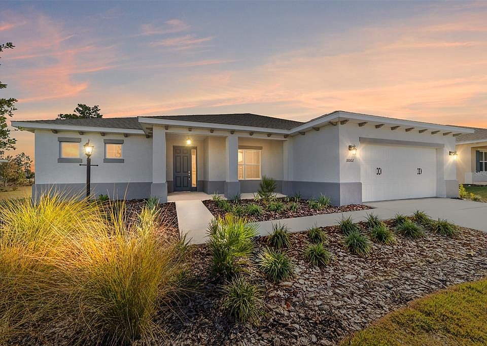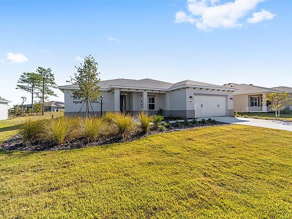 Experience brand new luxury and the highly sought-after 55+ lifestyle in this stunning Livingston model located in Longleaf Ridge at On Top of the World. This immaculate, move-in-ready home offers 1,718 square feet of living space, featuring a functional 2 Bed / 2 Bath layout and a 2-Car Garage with a dedicated Golf Cart Space. The bright, open-concept design includes a spacious Great Room, a dedicated Breakfast Area, and a Flex Room (ideal for a den or office). The gourmet kitchen is the heart of the home, showcasing beautiful white shaker cabinets, elegant quartz countertops, an oversized island, and new stainless steel appliances. Main areas feature gorgeous tile flooring, complementing the bright walls and abundant natural light. Enjoy the Florida weather and serene views from your private enclosed patio, accessible via large sliding glass doors. This home provides the benefits of new construction and access to all the world-class amenities this premier community has to offer. The perfect blend of elegance and easy living awaits! On Top of the World is Ocala's premier 55+ active adult, golf community with golf cart access to shopping, banking, restaurants, health and beauty.