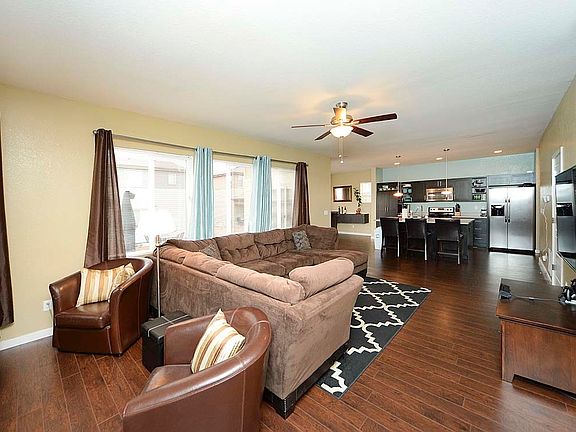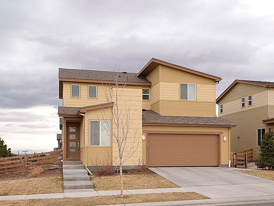 Newer 2 story home on corner lot with city and mountain views in the amazing Reunion Community! Residents of Reunion can access it's award-winning 21,000 sq ft rec center with indoor gymnasium, fitness center, party rooms, classes, events galore, numerous parks and large outdoor pool! Nice open floor plan on main level and lots of windows for plenty of natural light! The eat-in kitchen offers a large island with breakfast bar, 42" cabinets, stainless steel appliances, pantry and adjacent dining area with custom pendant lighting. Upstairs are all 3 bedrooms including the master featuring a large, walk-in closet with custom sliding door and master bath. The main level study can easily transform into a 4th non-conforming bedroom. Enjoy a low maintenance backyard with concrete patio, fire pit and beautiful views. Conveniently located with easy access to E-470 and I-76 and a quick drive to DIA for travelers!