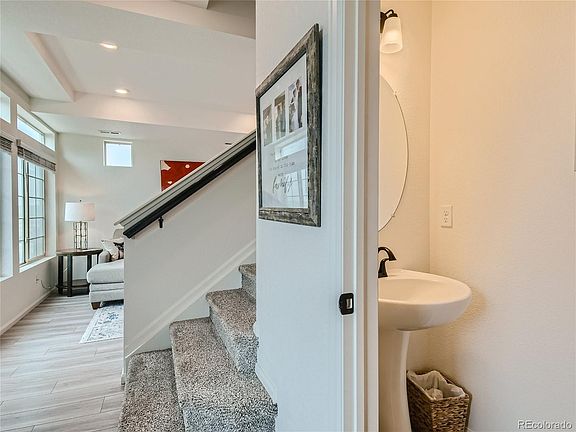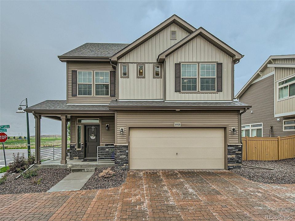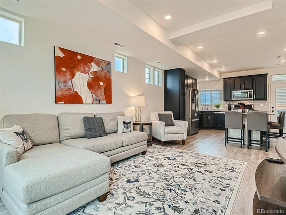 Welcome! This modern home in the desirable Reunion community shows pride of ownership and is full of upgrades. The extended wrap-around porch on a corner lot welcomes you before you even enter the home. Coming in, you will notice the beautiful LVT floors throughout the main level offering easy maintenance and durability. The main floor powder room is conveniently tucked away just off the entry. Note the blinds and extra can lighting when entering the family room and experience the open floorplan with lots of natural light. The stunning kitchen with its large extended center island (seats eight) is topped with upgraded granite. The beautiful dark blue kitchen cabinetry with gold hardware have pull out shelves in the pantry and a hidden trash/recycling cabinet. By adding the upgraded Gas range and Stainless steel appliance package, this is a "cooks kitchen". Just outside the kitchen is a low maintenance fully fenced back yard with an additionally fenced garden area. The professionally xeriscape plantings have an auto drip system. For water conservation and all year green grass, the back yard has low maintenance dog specific turf. All three bedrooms including the primary ensuite are located on the second floor with easy access to the laundry room. The primary suite has a walk in closet and private bathroom with large shower. The other two bedrooms share a hall bath. Note the hardware and fixtures have been upgraded though out this home. The HUGE flex room on the third floor offers so many options, tailor it to your needs! It connects to a private ROOFTOP DECK perfect for enjoying Colorado's sunny days or cool evenings! Don't like to shovel snow? The HOA is responsible for snow removal of driveways and sidewalks and maintains the front landscaping. With all that this fabulous community offers, it is situated only 20 minutes from DIA and 25 minutes from downtown. Wow! Don't miss out on this opportunity!