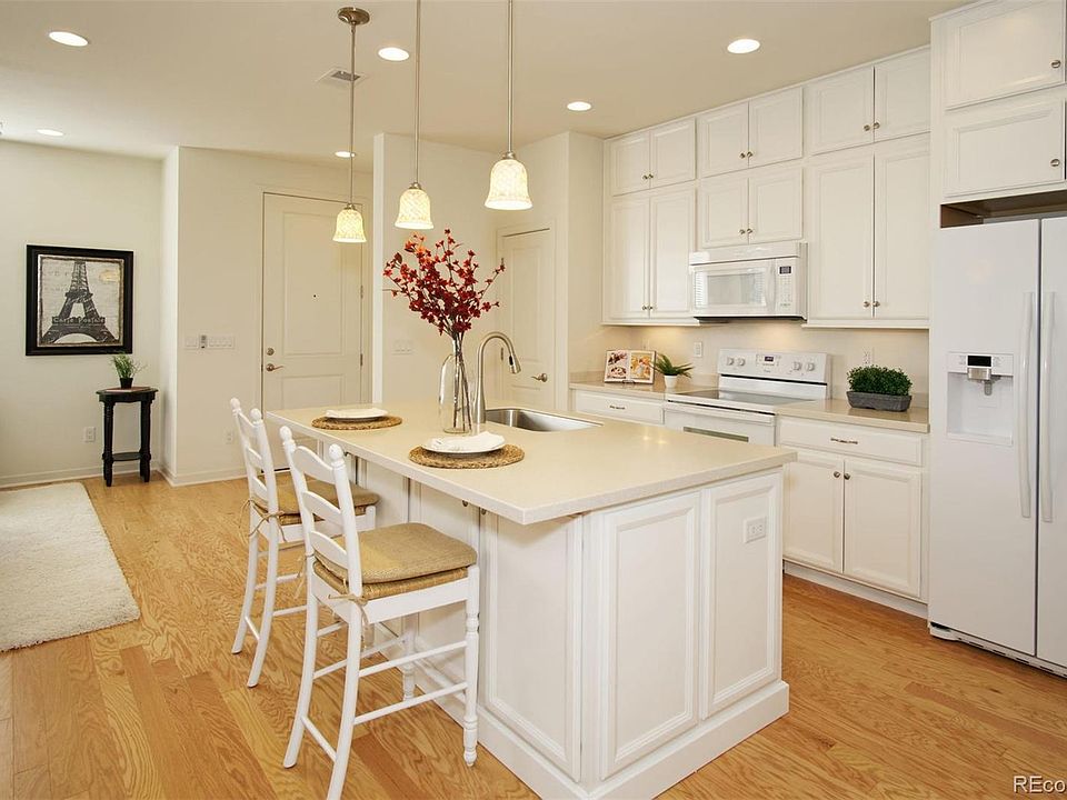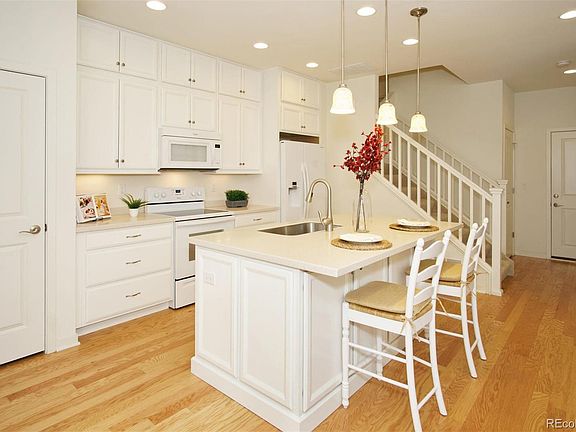 Move-in Ready Paired Single Family Home in Meridian Village! Facing a large open community space in front, this bright and airy 3 bedroom 3 bath home offers a lovely open concept floor plan with a large Kitchen, family room and dining area opening out into a professionally landscaped backyard with a spacious patio and mature landscaping. The Kitchen is a cooks delight featuring an expansive island with seating, Corian Countertops, under cab lighting, a stainless steel farm sink and additional stacked cabinets over the 42" Kitchen Cabinets. Enjoy the extensive hardwood floors on the main level and the 9' ceilings. Upstairs boasts 3 bedrooms, Corian countertops throughout all baths, walk-in closets, and a large 2nd floor laundry room. Most closets feature built in Elfa shelving systems and the garage is upgraded to an oversized 2.5 car garage with tons of built in shelving and storage! Close to Lone Tree Arts Center, the Light Rail, E-470 and Park Meadows Shopping and Restaurants!