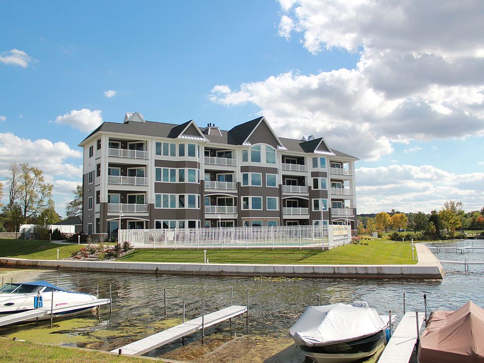 Main floor condo in brand new Condo building with 4 of the 12 units SOLD! 4 story building with 3 units on each floor. Commercial elevator. Units range from $595,000 to $1.333 million. Units sq ft range from 1543 to 3086 sq ft. All units have premium northwesterly long view of Lake Wawasee! Located on Southeast shore of Lake Wawasee, with 244 feet of main lake frontage plus 177 feet of channel frontage!Private garage for each unit plus assigned parking spaces and 20 guest parking spaces!Individual private storage lockers!Association heated inground pool with sun deck and 6' decorative security fence.Each unit has 2 boat slips and 1 personal water craft slip. 6 guest slips. 9' ceilings!Appliances included.Covered deck/porch with beautiful view!Monthly dues include all exterior,sewer,water,insurance,pier,snow removal,lawn care!
