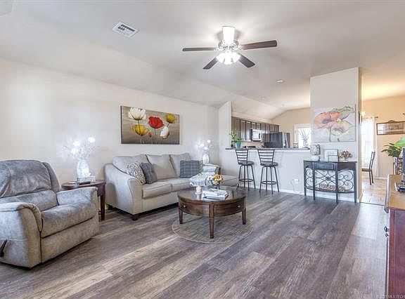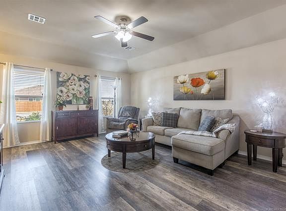 MOVE-IN READY! Stylish home w/great floorplan in established neighborhood. Large living room w/raised ceilings, great natural light & wood-look laminate opens to spacious eat-in kitchen w/gorgeous stained cabinets, stone-look counters, newer apps, bar seating & pantry. Sizable master; private bath w/shower/tub combo, double vanity & great storage. Big utility w/storage. Neutral paint & flooring throughout! Great fully fenced backyard w/covered patio. Easy HWY access; close to sports complex!