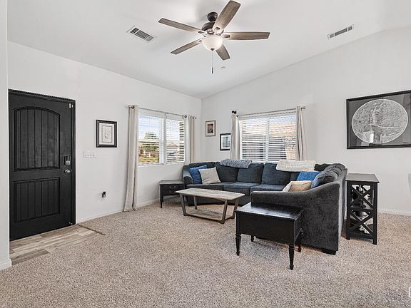 This turn-key 3 bed, 2 bath home is move-in ready! Enjoy great curb appeal, clean landscaping, and an extended driveway for extra parking. Inside, new fresh plush carpet flows through the main living areas, while the kitchen showcases sleek granite countertops, two-tone Kolville cabinets with soft-close hinges.Black accent doors add a modern touch, giving the home a fresh, contemporary feel. The primary suite features matching LVP flooring found in the kitchen and bathrooms offering a uniform aesthetic. Outdoors, the upgrades include a heavy-duty backyard retaining wall, extended cement patio for your outdoor entertaining, and EV charging station conveniently located in the garage. Conveniently located near Mesa Marin Sports Complex and a welcoming elementary school, this home offers the perfect mix of modern comfort and daily convenience.Don't miss out-this home is a true standout!