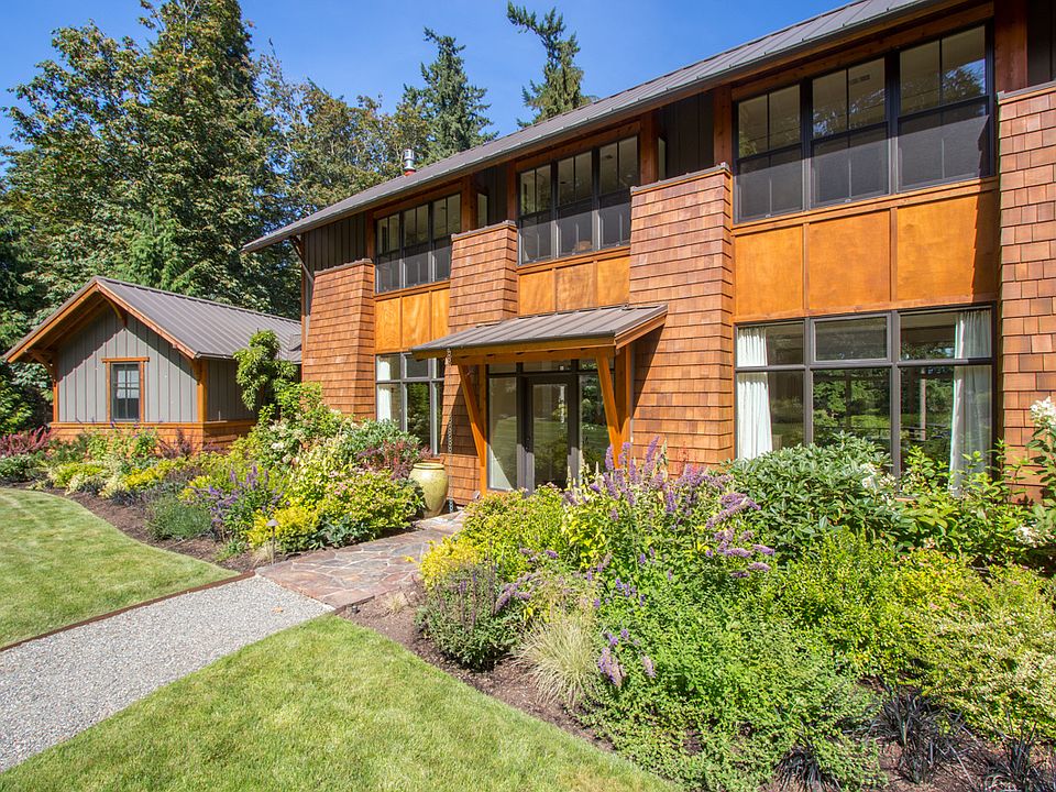 Peter Brachvogel design, pristine contemporary home on 3 private acres, beautifully landscaped. Open floor plan w/lovely, architectural detail & abundant natural light. Upper luxurious master suite w/spa like bath, second private master suite/guest room on the main floor. Gorgeous kitchen w/Viking range, Subzero refrig/freezer, plenty of storage/counter space. Den/library, upstairs office with built-ins. Sep. guest suite/studio/office, above garage with 1/2 bath. Fully fenced, sunny back yard.