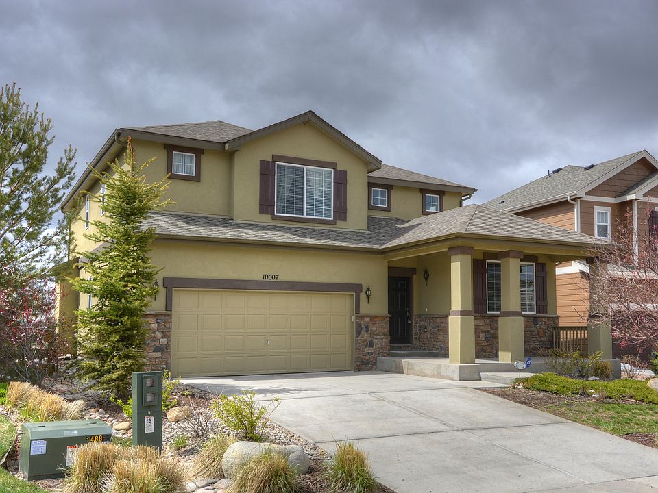 OPEN HOUSE, Saturday May 28. Free hot dogs, hamburgers, chips, soda and water this Saturday, Memorial Day Weekend. Please stop by our Open House on Saturday, May 28, 2016 from 1 pm to 4 pm. We are going to have the grill fired up while playing a few games in the backyard and enjoying the amazing views of Pikes Peak. Bring the whole family and your neighbors too, everyone is welcome. Beautiful former Chestnut Model Home from Richmond American with too many upgrades to list them all. The spacious home located in Meridian Ranch offers a dramatic entry with airy vaulted ceilings, as well as a formal living room with two-story ceilings and open U-shaped kitchen with a dining nook, pantry, all stainless steel appliances, upgraded cherry wood cabinets with solid Corian counter tops accentuated by the upgraded ceramic tile, hardware and lighting that is also featured throughout all bathrooms. You will appreciate the open and easy access to the family room while relaxing next to the cozy stone tiled gas fire place. As you walk through the French-doors that open to the study with crown molding, you can imagine the peaceful tranquility of your very own home office. The second-level includes the master suite, 2 additional bedrooms and a loft with built-in book cases and captivating overlook into the living room below. In the master suite you will enjoy 9ft ceilings with crown molding, walk-in closet and 5 piece master bathroom. The front and back yard of the home is professionally landscaped with outstanding views of Pikes Peak!