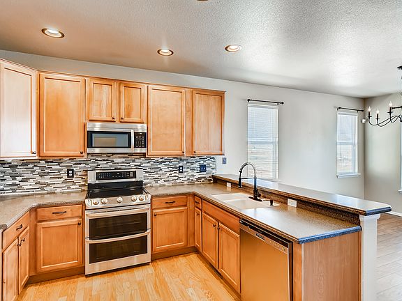 This beautifully laid out 4 bedroom and 3 bathroom home in Meridian Ranch is waiting for you! As you step inside you will notice the functional, open floor plan and beautiful natural light coming in through the windows that line the backside of the home. The stunning kitchen features Corian countertops, a breakfast bar for convenience, plenty of counter space, and steel appliances including an open plus convection combo! Outside in the backyard, you will find a lovely deck which makes a great place to set up a grill or just enjoy the peaceful views of the open area behind the house! The primary bedroom has gorgeous vaulted ceilings and an en suite bathroom with an oversized bathtub! Meridian Ranch has ample open outdoor space, miles of dedicated trail space, and several parks throughout the neighborhood. The Recreation Center has its own indoor and outdoor pools, a basketball court, multiple workout stations, a golf course, and plenty of activities for the entire family.