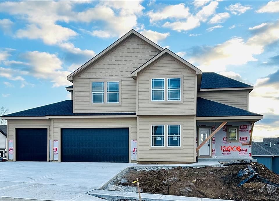The Jackson II by Northland Mgmt & Construction. This 2-story home, with 5 bedrooms and 3 full bathrooms, is located on a corner cul-de-sac walk-out lot. An open design with a kitchen island, tons of custom cabinetry, a large walk-in pantry, and a fireplace in the Great Room. Quartz countertops and engineered wood flooring are standard. With a full bathroom on the main level, this plan offers the flexibility of having a main floor bedroom/office/den, etc. Head upstairs to see the Texas-sized bedrooms!! Large laundry room on the 2nd level for added convenience. The unfinished walkout basement offers tons of natural light for a future finish! Don't miss out on this opportunity to buy new construction in Benson Place within the Shoal Creek Elementary boundaries. Benson Place residents enjoy an abundance of amenities including two community swimming pools, children’s splash park, fishing lake, playground, ample green space, scenic nature trails. Close proximity to major highways and interstates allows for easy access to downtown Kansas City, the NEW Kansas City International Airport, and several of the area’s top shopping and entertainment centers. The estimated completion is Spring/Summer 2023. Taxes, Square Footage, and Room Sizes are estimated. *Photos of finished home are Simulated*