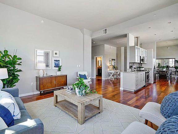 Coming Soon: Massive Penthouse Loft in Boutique Building. Welcome to this stunning 2 bedroom, 2 bathroom loft-style penthouse in the highly desirable Vue46 community, a warehouse loft building in Emeryville. This dramatic corner home offers soaring ceilings, concrete columns, and natural light flooding across 1,930 sq. ft. of living space on a single-level floor plan. The home offers a spacious corner living room overlooking the Oakland Hills to the east and Mount Tam to the west. The living room is open to the dedicated dining area and modern gas kitchen with granite countertops and stainless steel appliances. Beautiful American Cherry hardwood floors extend throughout the living spaces. This is a fantastic layout with bedrooms at opposite ends of the large living space allowing for maximum functionality. Add a gallery-style entry foyer; generous closet space; an in-unit washer and dryer; a very large wine refrigerator; side-by-side 2-car parking; and a huge storage area: this condo is special. Vue46 is a project of Levin Menzies & Associates of Walnut Creek, Kwan Henmi Architects of San Francisco, and Barry Swenson Builders of San Jose. Originally headquarters for Aluminum Cooking Materials, whose WearEver cookware products are still on the market today, Vue46 was converted in 2008 to 80 dramatic condos, townhomes, and lofts. Community amenities include a fitness center; a media room with a big-screen TV and surround sound; a controlled-access lobby; and a peaceful courtyard garden on the second floor. With several transportation options nearby, this loft is a commuter?s dream. It?s minutes to San Francisco via highway 80 and just a few blocks away is the free Emery Go-Round shuttle to the Macarthur BART station 1.1 miles away. With easy access to Berkeley, downtown Oakland, and Uptown Oakland, you?ll find plenty of shopping opportunities at the Bay Street plaza and IKEA and there are numerous restaurant options such as Honor Kitchen, Townhouse Bar and Grill, and Arizmendi Bakery. Emeryville, an industrial center that languished for years, changed its image in the 1990s by becoming an arts and business center. In the early 20th century, the city was also known for its gambling houses, speakeasies, and racetracks. In recent decades, Emeryville not only cleaned up its industrial areas but also welcomed biotech firms, software firms, and technology companies such as Pixar Animation Studios. In 1990, the city approved an Art in Public Places program, and, since then, the arts have flourished. UNIT FEATURES: * 2 bedrooms, 2 bathrooms * 1,930 sq. ft. per tax records * Top-floor corner penthouse * Single-level floor plan * Elegant gallery-style entryway * Corner living area with Oakland/Berkeley Hills views and downtown Oakland skyline views * 5 banks of warehouse-style windows * Linear kitchen with ample cabinetry, granite counters, and gas stainless steel appliances * American Cherry hardwood floors in living areas, carpeted bedrooms, tiled bathrooms * Master bedroom with en-suite bathroom * Walk-in storage closet in foyer with large capacity wine fridge * Enormous double storage unit included * Side-by-side 2-car parking in building garage BUILDING FEATURES: * High-end boutique building converted from a historic warehouse to lofts in 2008 * Multiple lobbies * Elevators * Gym * Media room * Bicycle storage in garage 11