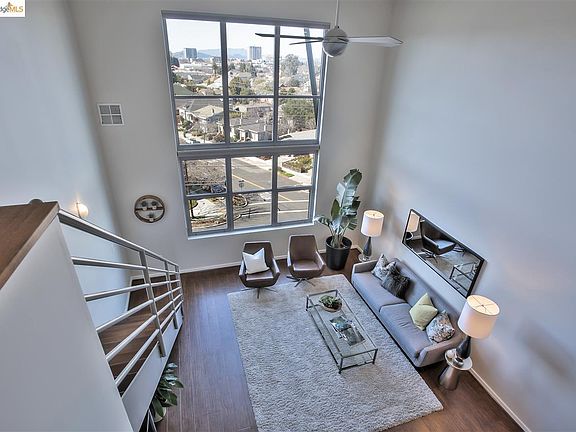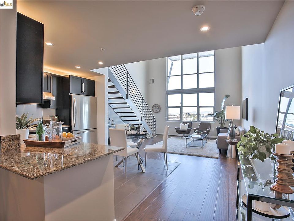 This stunning 2 BEDROOM, 2 bath condo (tax record show as a one bedroom) is in the highly desirable VUE 46 community. Unit 515 is on the top floor and faces West to endless City views and glorious sunsets. There is an abundance of natural light due to the soaring high ceilings and giant large windows that overlook Emeryville and the San Francisco skyline. On the main floor is a bedroom or den, huge full bath, and an open kitchen with stainless steel appliances that enhances the unit's easy living lifestyle. Upstairs is the master bedroom, with custom closets, master bath and a separate office area. In-house laundry makes this an ideal place to call home. The Vue community offers a fully equipped gym, TV/party/meeting room, and gated parking. Conveniently located close to BART, minutes to San Francisco, fine East Bay restaurants and shopping.