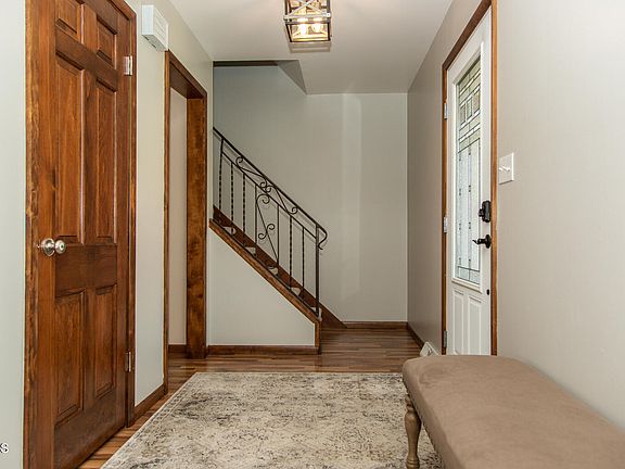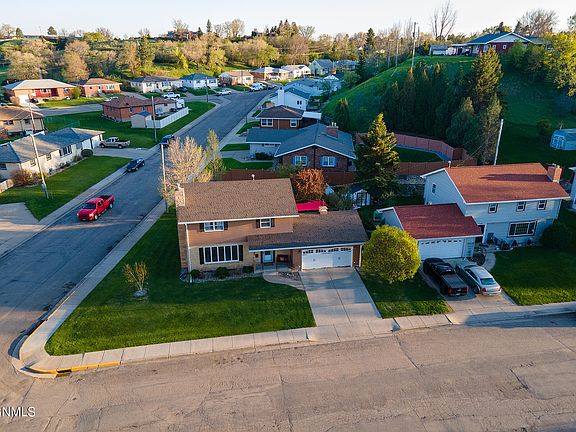 You must see this updated 2 story home in a great central Mandan area. This unique home was built by the builder for his family and is only a 2 owner home. The main floor features a living room with newer hardwood laminate flooring, a gas fireplace with stone accents, a formal dining area and an updated kitchen with beautiful cognac stained maple cabinets, a large island with seating, granite counters and newer stainless appliances. The appliances are all newer and the range is a convection with built in air fryer mechanism. There are patio doors leading to the large deck in the partially fenced yard. There is also a guest half bath on the main. The upper level features 4 bedrooms plus an updated bath with tile with access to the primary(master) bedroom. The lower level has a family room with gas fireplace, a wet bar with a bar fridge and wine cooler included. There is another updated bath, a utility/laundry room with front loading washer/dryer included. This beautiful home is move in ready and features gorgeous rich stained woodwork and paneled doors. There is a double attached garage. There is Colorlok siding, newer garage doors, the shingles were replaced a few years ago, the water heater was recently replaced and the Furnace and air conditioner were replaced about 15 years ago. This is a very well maintained move in ready home! There are underground sprinklers in the beautifully landscaped yard.