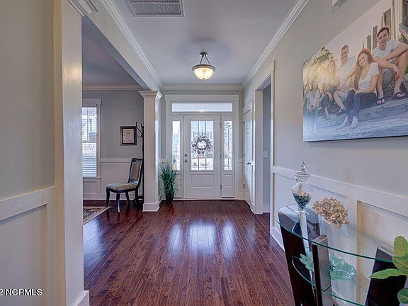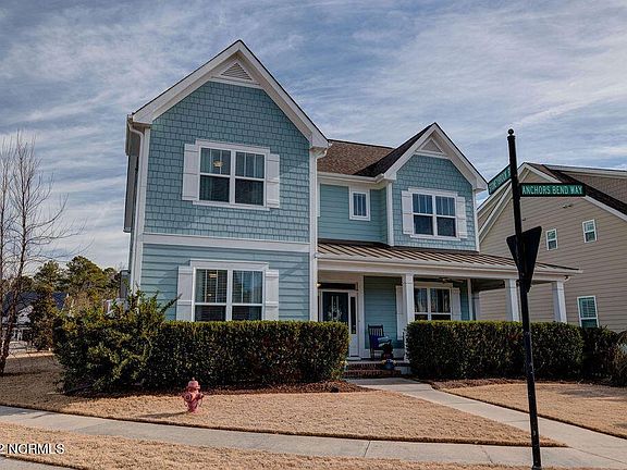Welcome to this well-maintained and popular Charlton floor plan, perched on a corner lot in Anchors Bend! This lovely home boasts over 3200 square feet and has the most welcoming, oversized front porch. Once you step inside, you will find a formal dining room, perfect for hosting friends and family. Through the entry is the spacious, open concept living room and gourmet kitchen with large island and additional eat-in area. The kitchen features built-in convection wall oven, microwave, gas cooktop, extra storage in the island, large pantry, and custom tile backsplash. Just off the kitchen is a drop zone for organizing back packs, beach bags, coats and shoes. There is also a full laundry room with a utility sink, and additional closet and cabinet storage. Don't miss the screened back porch leading to a patio. The primary suite is also located on the first floor and has a walk-in closet and light-filled bathroom. There is a full hall bath located on the main level. Upstairs offers 2 full baths, one with a double vanity. There are 3 bedrooms, all with walk-in closets and a spacious flex room with a large closet that could be used as an additional bedroom, playroom, home gym, office or media room. Anchors Bend, with sidewalks throughout, features a community pool, open air pavilion with outdoor grills and seating. Low HOA dues and no city taxes! The proximity to Mayfaire, Wrightsville Beach, ICWW, several marinas and schools make this one even more desirable. Come join the Anchors Bend Community!