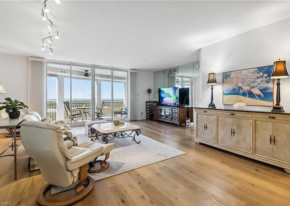 Experience the epitome of paradise in this stately and sophisticated luxury condo, inspired by Serena & Lily. Located in the heart of Tower Pointe at Arbor Trace, this completely renovated residence exemplifies timeless elegance and superior craftsmanship. Upon entering, you're greeted by breathtaking views of the Gulf of Mexico, visible from the spacious great room. The sleek wood-look flooring seamlessly flows throughout, complemented by a refined foyer design and thoughtfully curated designer lighting that enhances the inviting ambiance of each tranquil room. The gourmet kitchen is a timeless masterpiece, featuring a thoughtful layout, granite countertops, and sleek stainless-steel appliances. Two distinct outdoor living spaces provide the perfect setting to savor a sunrise with morning coffee from the kitchen or enjoy a sunset from the great room or principal suite. Adding to its appeal, this exceptional home boasts a highly sought-after two-car garage, making it a rare gem in a coveted location. Arbor Trace offers exceptional amenities, including a resort-style pool, tennis and bocce courts, a golf putting green, special events, and gourmet dining at the clubhouse. Benefit from comprehensive support services such as 24-hour medical monitoring, transportation to medical appointments, shopping, and group outings. Arbor Trace is a vibrant 55+ community that offers the unique advantage of deeded condominium ownership with 100% equity and no financial or medical requirements, allowing you to rent, sell, or pass your home to your heirs. Enjoy peace of mind with an onsite continuum of care.