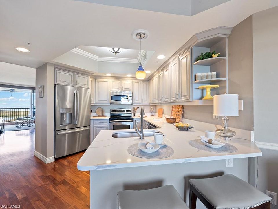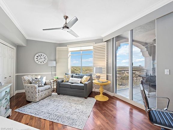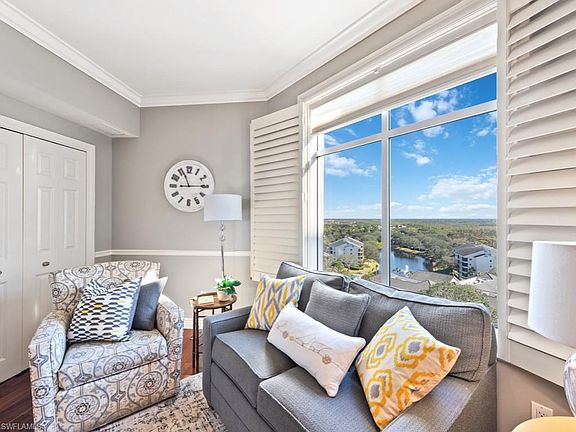 Wake up to stunning gulf views across lush mangroves in this updated 2 bedroom plus den unit in Tower Pointe at Arbor Trace. This home's best feature may be the outdoor living spaces from both front and back terraces, offering Gulf and lake views plus a cross-breeze to enjoy the beautiful Naples weather. Tray ceilings in the master bedroom and en-suite bath add height that mirrors the home's 12th floor location. The bath features his-and-her sinks, a spacious walk-in shower and a nearby custom built-in closet. The guest bedroom with a sliding glass door to the terrace is the ideal size for visiting family and friends, or would make the perfect home office. Rich chocolate brown hardwood floors throughout most rooms compliment the contemporary gray walls in the living room and den that are accented with white chair rail molding. The bright stainless steel kitchen with sparkling white quartz countertops make for an ideal gathering place while entertaining. Spectacular sunsets await this move-in ready home. Arbor Trace is an active Senior Living Community with 100% equity ownership and unparalleled amenities offering invaluable peace of mind.