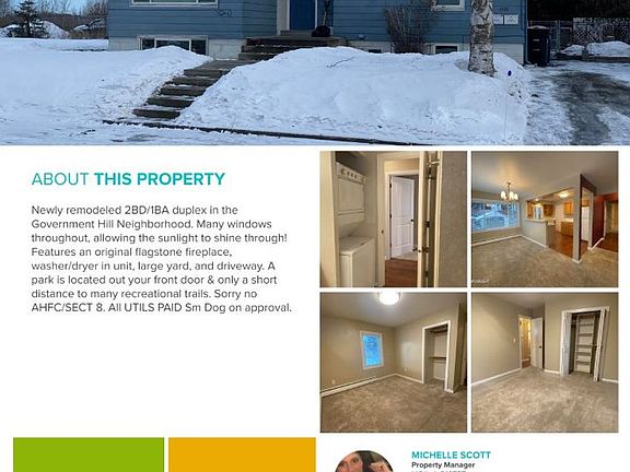 Amazing Government Hill Home with Beautiful Views! - Newly remodeled 2BD/1BA duplex in the Government Hill Neighborhood. There are many windows throughout, allowing the sunlight to shine through! Features an original flagstone fireplace, washer/dryer in unit, large yard, and driveway. A park is located out your front door & only a short distance to many recreational trails. Beautiful views of the Alaska Range, Mt. Susitna / Sleeping Lady, and the Port of Anchorage. Sorry no AHFC/SECT 8. A small dog may be considered on approval. $1950 a month and all utilities are included. Offered by Property Manager, Michelle Scott. WELCOME HOME! Thank you for allowing Alaska Property Managers LLC to assist you with your new home! This rental application will enable us to determine if you are qualified for your preferred rental property, therefore, it is very important that you fill out ALL the information requested. To ensure a fluid process, please ensure that you have the following additional information with the application: APPLICATION FEE ** Any person that is 18 years and older MUST fill out an individual application ** There is a $35.00 non-refundable processing fee per application that must be paid prior to processing this application. SECURITY DEPOSIT Unless otherwise noted a Security Deposit equal to one month's rent will be required and will be required to be paid in full by Cashier's Check or Money Order within 24hrs of application approval to secure the rental. IDENTITY VERIFICATION For each applicant or co-signer, we will need a copy of your driver's license or Military ID. EMPLOYMENT VERIFICATION All occupants will need to make 3 times the amount of rent per month. Please include four of your most recent pay stubs for verification. If you are beginning a new employment position, please submit a letter of employment intention. Military applicants may submit their 4 most recent LES. If you are self-employed, please provide a copy of last year's tax documents or 6 months of recent bank statements; and a current Profit and Loss Statement. We can also send verification of income if we feel the proper information has not been provided. CREDIT VERIFICATION Credit scores of each applicant must be that of 600 or greater. No Evictions, Judgements to past/present Landlords, utilities, etc. The Property Manager may approve a co-signer for a declined credit verification for an applicant with no credit but with good landlord references. If so, the co-signer would need to go through the same application process. If approved, the tenant may be required to pay by certified funds. PET SCREENING We use a third-party pet/animal policy and screening service. All Applicants should go to this link: https alaskapropertymanagers. This is required of ALL tenants and is considered part of the application process. The Property Manager will tell you when you should go to the site to complete the Pet Screening Questionnaire. DISCLOSURES Property amenities/features listed above are deemed reliable but are not guaranteed. Prospective applicants should verify all amenities/features to their satisfaction. Landlord is not liable for any typographical errors or mistakes in amenities/features listed. We do business in accordance with Federal and State Fair Housing laws.