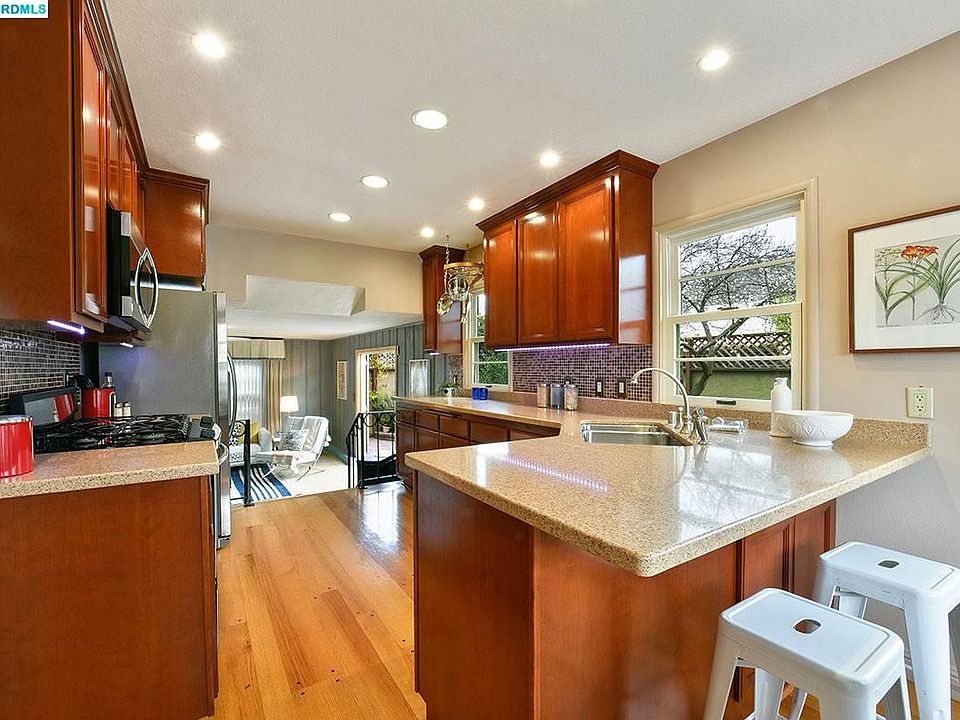 Gorgeously renovated mid-century near all the action: beach, shopping, transportation & sought-after East End K-12 schools. Gourmet kitchen w/bfast nook, remodeled baths, family rm flows into landscaped yard/BBQ area w/pavers, fire pit. Laundry rm, AC, 2-car garage, lots of storage, well maintained!