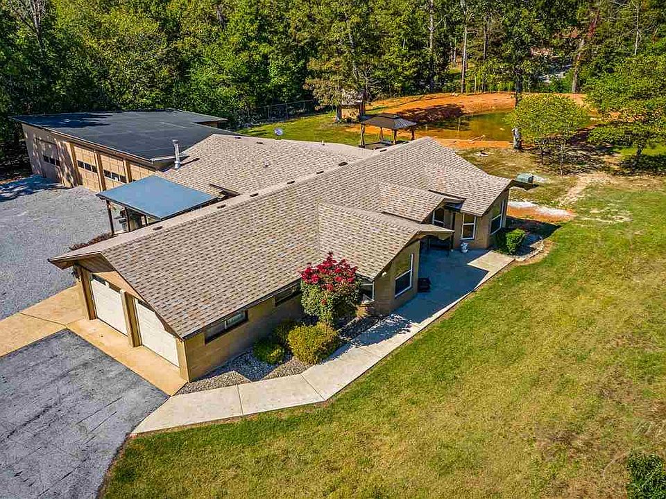 Rare opportunity to own this all brick home with 6 car garage!!! Relax and enjoy the wildlife under the gazebo surrounded on your 1.28 acres with your own pond with fountain. Home is very well cared for with 3 /4 bedrooms plus large living room with woodstove plus raised ceilings leading to covered porch great for grilling. Property is fenced with shared security gate. Ideally located walking distance to shopping, bank, pharmacy, city hall and post office. Enjoy the clear waters of Bull Shoals Lake and the world famous White River just five minutes away. The garage space is every man's dream with two car garage attached and at opposite end is a 4 bay heated/cooled garage with one of the bay's tall enough for an RV. One bedroom is separate which can be converted to additional shop/storage if desired.