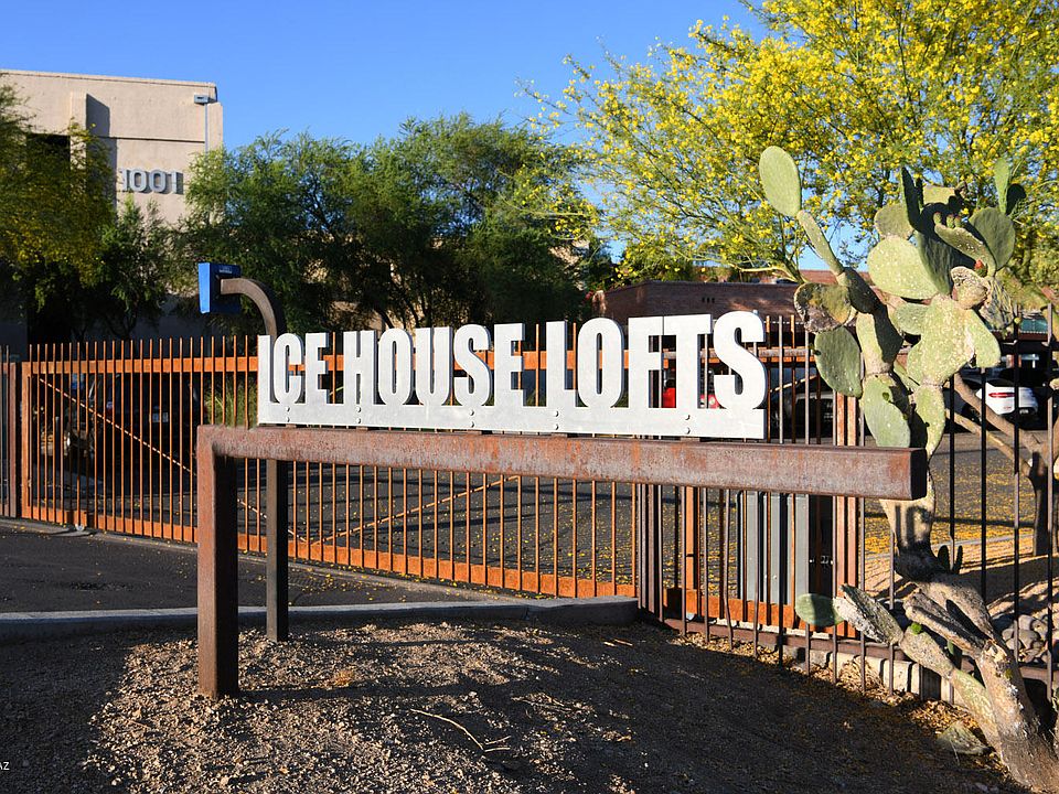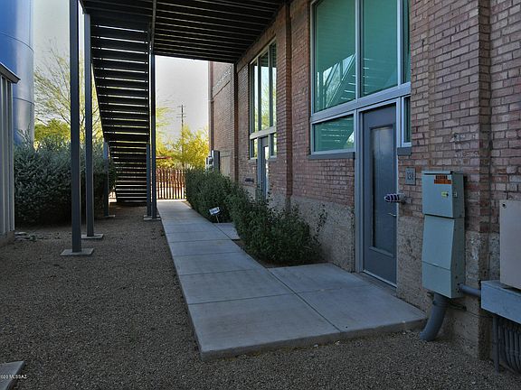 Cool place to call home in the Ice House Lofts, ground floor unit in excellent move in condition. Private downstairs end unit, with 16 foot ceilings. Lots of huge windows, and dramatic exposed brick walls. One of only a few units with it's own small backyard. Near the pool and storage room. 2 full baths, and 2 parking spaces, one covered. All appliances included, and just a few minutes (by bike) to the U of A and downtown.