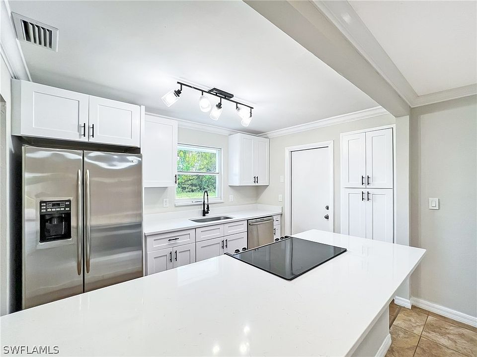 Welcome to Lehigh Acres! Boasting 3 bedrooms and 2 baths spread across just over 1400 square feet of living space, this residence offers a perfect blend of functionality and elegance. The heart oft his home is the kitchen. Here you will find quartz countertops, stainless steel appliances & shaker cabinets complimented by dark hardware. The seamless tile flooring throughout the living areas and bedrooms adds durability and easy maintenance to your daily living. Step outside to the expansive screened lanai, providing a peaceful retreat with northern rear exposure, ideal for enjoying Florida's beautiful weather year-round. Recent updates include a new shingle roof in 2022 and a new A/C in 2024. Don't miss this the opportunity to make this meticulously maintained home your own and experience the best of Lehigh Acres living.