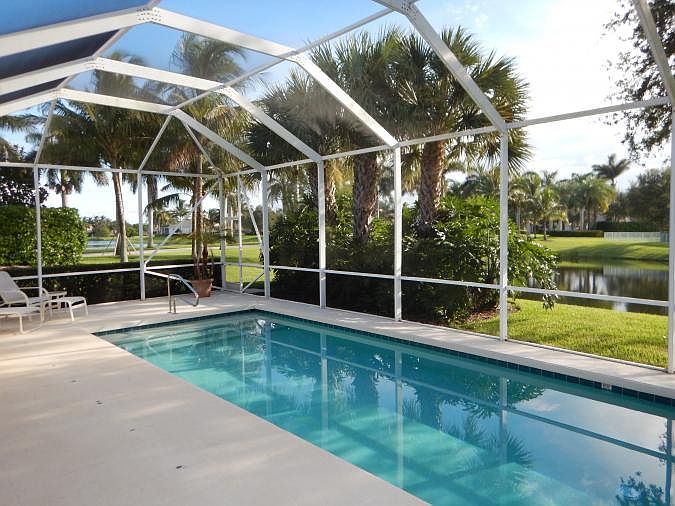 Fully Furnished Pool Home available for immediate occupancy. This home is found in the coveted Isles at Palm Beach Gardens. This 3 Bedroom, 3 Bath plus a Den has over 2400 square feet of living space. Quality and craftsmanship of this home is exceptional. Here you will find high ceilings and Crown Molding. Living room with French Doors, Dining room with kitchen pass through and an accommodating Family room with sliders opening up to the patio and pool. Kitchen comes with 42 Cabinets, Corian Counter Tops, and Stainless Steel Appliances. Spacious Master suite is complemented with a large bathroom which includes Dual sinks, Roman Tub and Separate shower. The den comes complete with wood floor and built in. This spacious home is full of light. Home is on a premium lot with views of the lake. Entertain outdoors under the large screen-covered patio and enjoy the pool. You will find this home is perfection in Paradise, and a great location being close to shopping, dining and so much more. Just bring your suite case everything else is already here.