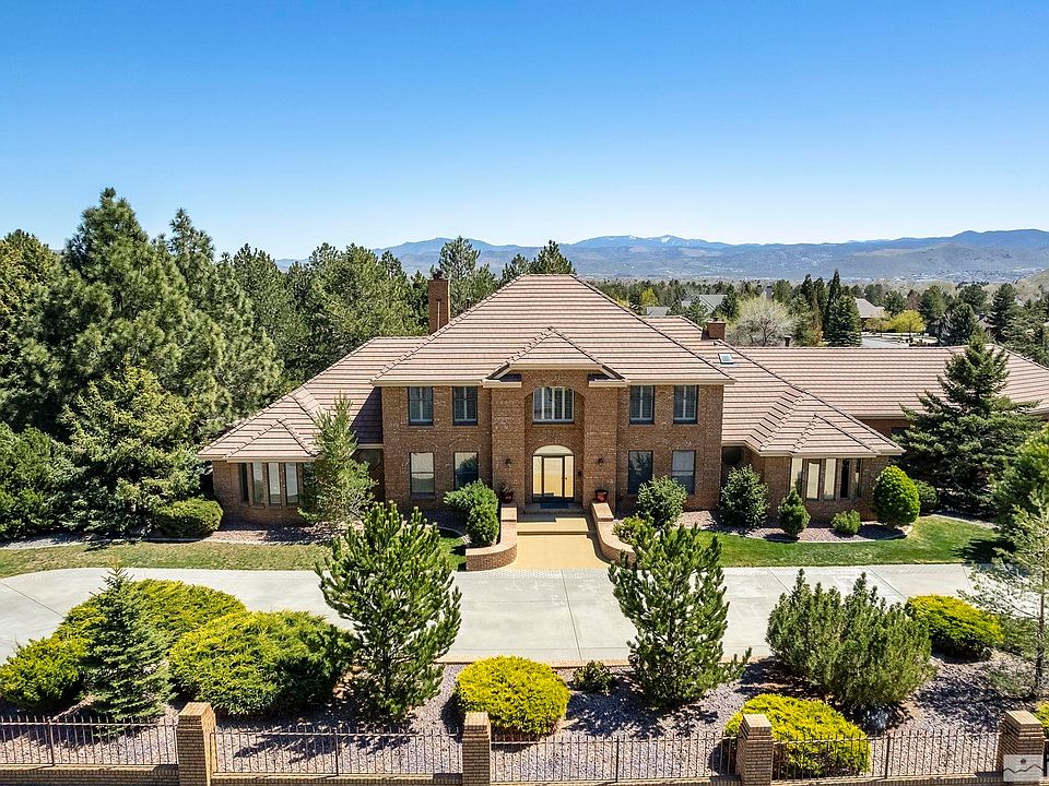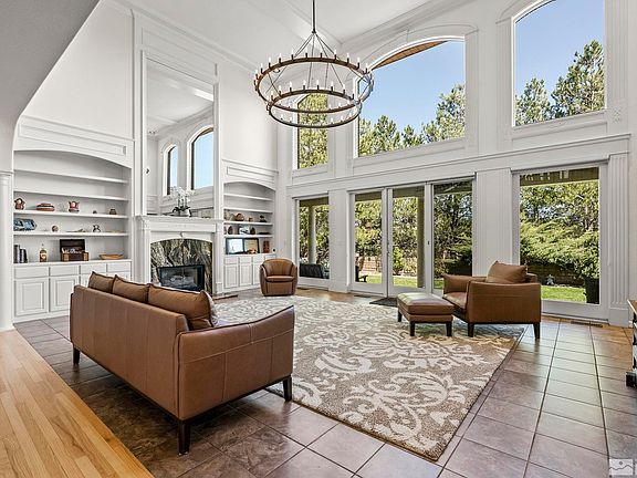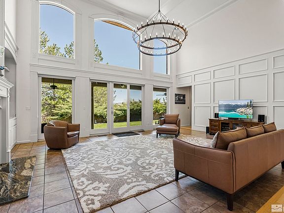 Welcome to Kensington Manor. This spectacular Kingston Estates home sits on an acre in Carson City’s prestigious west side. In addition to its 5,517 SF, the home boasts a 672 SF fully finished basement that doubles as a Safe Room. With the dramatic soaring ceilings, extensive hardwood paneling and molding, intricate reliefs, granite, Quartzite and ceramic tile, hardwood flooring, pillars, Anderson windows, wood doors, and custom cabinetry throughout, the attention to detail in every room is apparent., When entering this home, there is a commanding foyer that leads to the Great Room. The double-height ceiling is impressive as are the floor-to-ceiling windows complete with fully adjustable motorized rolling shutters and large 2 tier iron chandelier. The breathtaking granite fireplace is complimented by built-ins on either side. The generously sized dining area boasts beautiful hardwood floors. An entertainer’s dream, it comes complete with a butler’s pantry that includes a prep sink, lots of cabinet and drawer space for fine crystal, china, and silver and a Thermador warming oven. The oversized kitchen is second to none. Recently remodeled with new floors, Taj Mahal Quartzite countertops and Jacaranda Quartzite center island and new full kitchen backsplash. It comes complete with what the most of discerning gourmet cooks expect: a Thermador fridge, a SS Thermador natural gas range, built in Thermador microwave drawer, a custom vented island hood, two KitchenAid convection/broil/bake ovens, two sinks, dual wash stations with disposals, a wine refrigerator, a walk-in pantry, built-in wine racks, and an outrageous amount of cabinet space. The eat-in kitchen is perfect for informal dining. Next to the kitchen is a sunken Family Room with exquisite wood paneling and a pellet stove. Between the Great Room and the Family Room is a large wet bar complete with yet another wine refrigerator new quartzite counter and bar top. Also on the first floor is a spacious office with gorgeous built-in custom cabinetry that could be used as a fifth bedroom. The first primary master suite has its own automatic natural gas fireplace, with Jacaranda Quartzite surround and hearth, a wet bar with Jacaranda Quartzite countertops, and a very private patio. The master bath is what you would expect in such an exquisite home, having dual walk-in closets, dual vanities, with Taj Mahal Quartzite counter tops and glass bowl sinks, a private bidet/toilet closet, a jetted tub, a steam shower with heated floor and a skylight. Upstairs is a second primary suite with a large remodeled shower, a walk-in closet and a linen closet. On the other side of upstairs there are two more bedrooms connected by a Jack-and-Jill bath. All bedrooms are over-sized and have large walk in closets for plenty of storage. The Safe Room, accessed through a 3”-thick SnapSafe Door, comes complete with a half bath, a wet bar and infrared sauna. Vault door to secure your safe room. The large laundry room is equipped with a built-in ironing board, a deep wash sink, extra storage, a large counter, and includes the LG Direct Drive washer with pedestal washer and LG Sensor dry, steam dryer with storage stands. The four-car garage is an oversized 1,377 SF and has its own Reznor heater, coated floors with Wi-Fi garage door openers. Trailer and RV parking is a breeze with the back driveway that runs from Kensington Place on the south side of the property to Manhattan Drive on the north side complete with a 50 amp RV hookup.