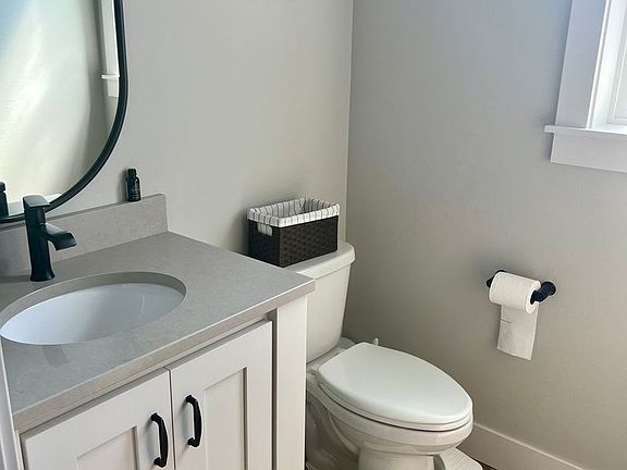 Solid surface counters with matching 4-inch backsplash and Luxury Vinyl Plank (LVP) flooring in hall bath, and powder room