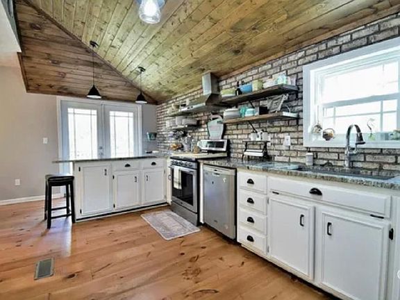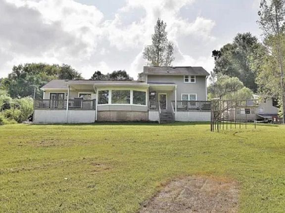 It's a split level, open floor plan downstairs. About 2000 sq feet. 2 BR, 2.5 BA. Upstairs is an oversized bedroom with full bath. Downstairs is 2nd bedroom with private bath, living area, half bath, kitchen and laundry/mud room. It's off of Goat Rock Rd and backs up to Goat Rock / Mulberry Creek. 1 year lease required. Utilities are renters responsibility. Has propane stove and water heater. High speedd internet available and County water.