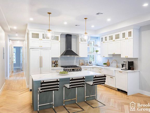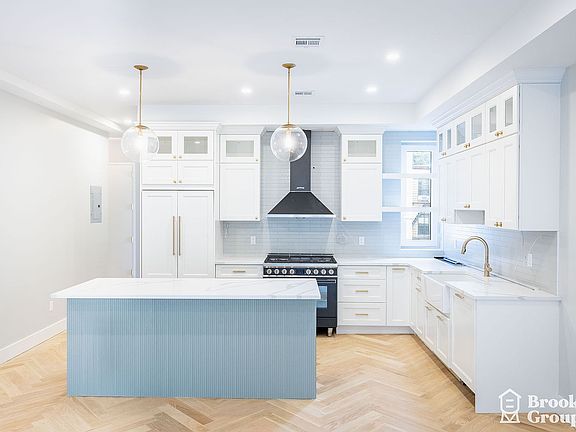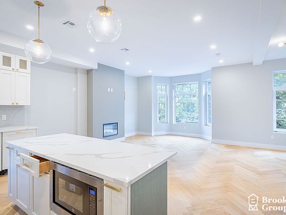 Introducing 1001 Lorimer, a stunning gut renovation in a 3 family home in Brooklyn's most sought after neighborhood. This three bedroom, two bathroom home boasts meticulous attention to detail while maintaining the charm and integrity of this unique building. The expansive living area beckons for both intimate gatherings and grand celebrations. Lined by white oak herringbone floors, the main living area opens up to oversized bay windows that invite loads of bright natural light into the space. Unwind by the fireplace or enjoy a drink at the sleek marble wet bar with a stainless steel wine fridge accompanied by stylish built in storage. The Carrara marble island stands as the focal point to this residence. Equipped with top-of-the-line Smeg appliances, delicate sage green fluting and bespoke brass hardware, this kitchen appeals to the modern and elegant renter. Just one floor up is an expansive roof deck with sweeping city views. The primary suite offers a calming oasis from city life with a fully customized walk in closet and ensuite bathroom with spa like finishes. His and hers shower heads, a walk in shower with elegant tiling, dual vanity and a peaceful freestanding tub converge to create an ambiance that's both serene and invigorating. The home is accompanied by two additional bedrooms with ample closet space and large windows that bring the outside in. The second, fully tiled bathroom echoes the style and elegance of rest of the home. High end, in unit washer and dryer are tucked away for convenience and hallway closets provide abundant storage space. Nestled on a coveted historic block, 1001 Lorimer offers a connection to Greenpoint's rich past while embracing contemporary living. It's situated just steps from the Nassau Ave G train, making the commute a breeze and is surrounded by some of the best food and shopping the neighborhood has to offer. Less than two blocks away from McCarren park, this Greenpoint haven sits at the pinnacle of urban convenience and modern luxury.