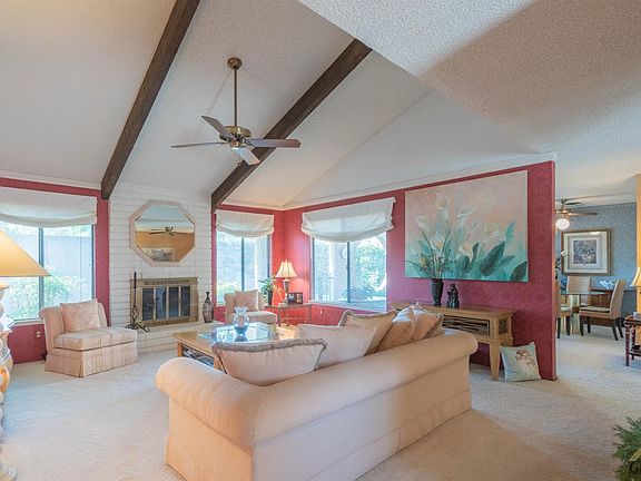 GATED Greenbriar Condo! This 2/bd, 2/ba, 2 car garage, is tucked away in the gated enclave of Greenbriar near the hub of shopping, restaurants and freeways. This charming home boasts of spacious vaulted ceilings and open concept living to include formal living, den, breakfast dining and breakfast bar! A charming kitchen offers abundant cabinets, glass cooktop, micro/oven combo and porcelain tile wood-like flooring. The adjacent breakfast dining space includes a view window and double French doors to a private covered patio. At the center of the formal living space is a brick, floor to ceiling gas fireplace flanked by large picture windows and handsome wood-beam vaulted ceiling. The expansive owner's suite is appointed with sitting area, double French doors to the second private patio, walk-in wardrobe & dressing area and ensuite. Window coverings and oil-rub bronze plumbing fixtures, ceiling fans and air purifier. There is a community pool, spa and green space.