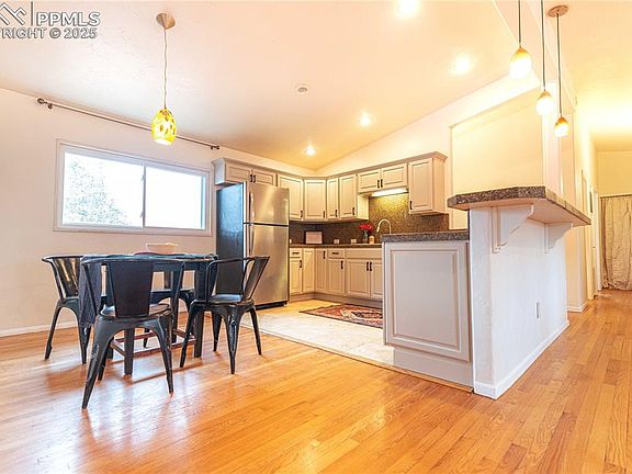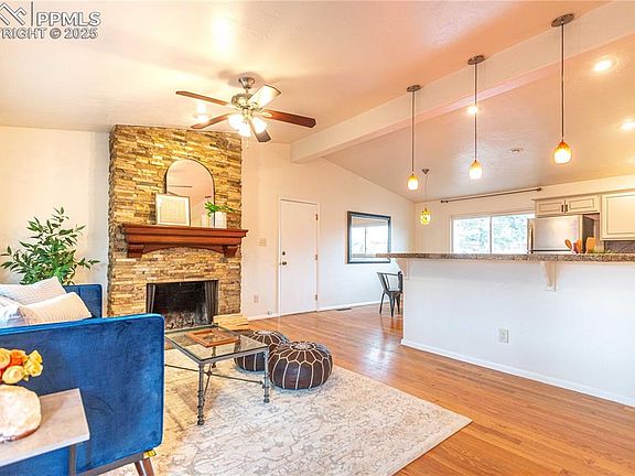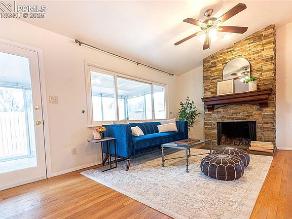 True main level living on this stunning remodeled ranch on a corner lot in Skyway Park with sun room! Original real wood flooring throughout with no carpet anywhere and lots of natural light all near award winning District 12 schools! Bike or walk to open space and trails with easy access to Bear Creek and Stratton Ridge Open Space. Mountain views and easily commute to Cheyenne Mountain or downtown Colorado Springs in a flash with all military installations close by. Minutes to the best attractions in Colorado Springs including Garden of the Gods, Pikes Peak, Ivywild School, The Broadmoor, Seven Falls, Cheyenne Mountain Zoo. You'll love the west side! No HOA, low taxes, amazing location and all in a truly turnkey home. Everything has been done for you! Newer windows, newer landscaping with xeriscaping, new fence, newer roof, newer retaining wall, great patio, sunroom, new slide in stainless steel oven, new stainless steel dishwasher, newer fridge, all new paint inside and new paint outside, newly refinished deck, refinished kitchen cabinets, new hardware, refinished bathroom cabinets with granite tile countertops, sprinkler system, wood burning fireplace, and more. This one is a real gem and available for quick move in so don't wait on it!