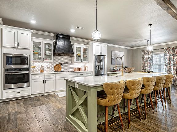 This stunning Craftsman-style home exudes timeless charm with black windows and semi-custom details, including a striking 150-pound antique rustic mantle from a historic St. Louis warehouse and beautiful wood-like tile throughout. The gourmet kitchen is a centerpiece, featuring a custom wood and frosted glass pantry door, an oversized island seating 7-8, and ample space for entertaining. Outdoors, enjoy the heated saltwater inground pool with a unique custom shape, lush landscaping, and mature trees for ultimate privacy. Relax by the outdoor gas log fireplace or take advantage of the matching outbuilding for added functionality. With direct gated access to Bentonville West High School, this home perfectly combines elegance, comfort, and convenience!