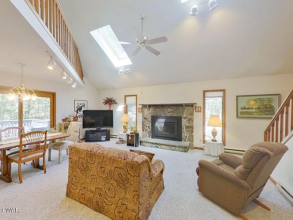 This one is on a corner lot location, a ''Bob Holiday Homes'' built, 3 bedroom, two bath contemporary with signature 3/4 loft in Wallenpaupack Lake Estates with community access to Lake Wallenpaupack. 2 car detached garage, expansive entertainment decking, AC, tongue and groove accents and fieldstone gas fireplace are enhancements making this just right for every occasion. Community amenities include indoor and outdoor pools, paddling lakes with beaches, tennis courts and more!