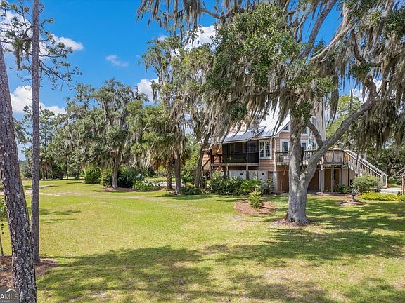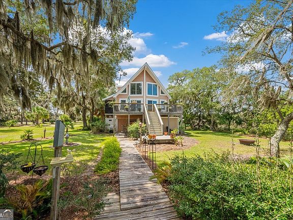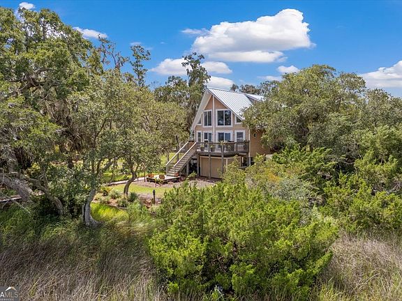 Discover coastal living at its finest with this 3 bedroom, 2 bathroom home perched along the tidal South Newport River. Nestled at the end of a quaint neighborhood peninsula, this property offers unmatched privacy with water on two sides, sweeping marsh and ocean views, and your very own private dock at the river's mouth. The home sits among majestic oak trees and feels wonderfully secluded-yet you're only 5 minutes from I-95 and conveniently located between Savannah and Brunswick. Nature lovers will enjoy frequent deer sightings, landscaped grounds, and tranquil surroundings that feel worlds away. Inside, you'll find thoughtful updates including a new metal roof, new carpet, fresh paint, and new kitchen appliances. Fiber optic internet is installed, and the home includes Generac generator system-capable of powering the entire home for up to 10 days. Additional features include a raised foundation with brand-new storage underneath, a cinder block walk-in tornado/emergency shelter, and a large front deck plus side porch perfect for taking in the views. The upstairs master suite includes an office nook and oversized walk-in closet. The living room showcases breathtaking water and marsh vistas, while the open design allows you to fully enjoy the natural setting. This sale also includes an additional .55-acre lot (Tract 2), providing even more room and value. Whether you're seeking a full-time residence, a peaceful retreat, or a nature-lover's getaway, this property offers the rare balance of seclusion, beauty, and convenience.