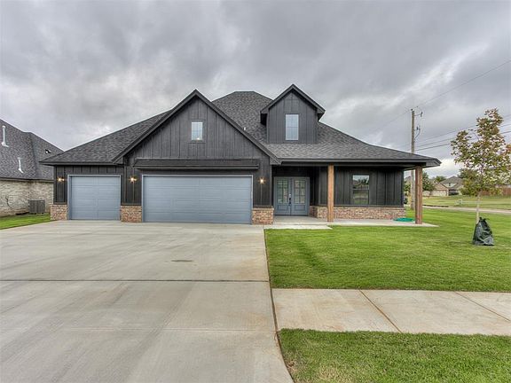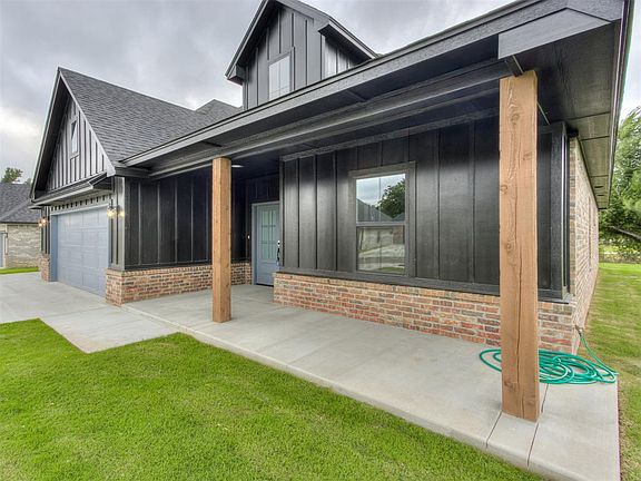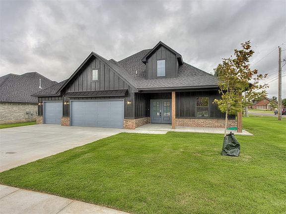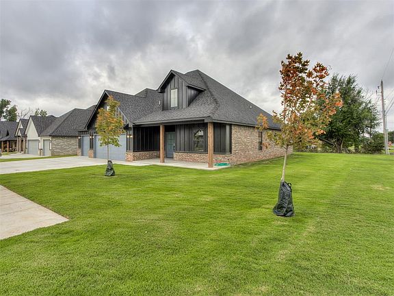 Gorgeous brand-new home in Midwest City! Beautifully designed inside and out; from the soft blue double front doors, exposed beams in the entry way and living room, and custom herringbone patterned tile work on the fireplace, you’ll be captivated by the details. The kitchen is a true highlight of this home, complete with marbled granite countertops, a large island with cabinet storage and seating, stainless steel gas stove with a griddle, and a large pantry with counterspace, and built-in shelving, wine rack, and microwave. The primary suite has your dream bathroom! Double vanity, modern soaking tub, sizeable standing shower, and spacious closet with shelving and built-in dresser. Other perks include a built-in desk area in the office, a powder bathroom off of the foyer, secondary bedrooms are connected by Jack and Jill bathroom, in-ground storm shelter in the garage, and a lovely covered back patio. Great location! Three miles from Tinker AFB, just 25 minutes away from Downtown OKC, located in Carl Albert School District. Make this gem your new home!