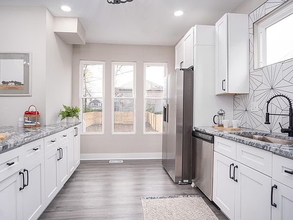 This home has been renovated top to bottom! Spacious family room with tons of natural light. Open kitchen features breakfast bar, granite, premium tile backsplash and stainless appliances. Bedrooms are spacious and share a beautifully renovated bath. Exposed brick accents throughout. First floor laundry. Front porch is great for entertaining. Back yard is big with a new fence. Parking area outside the fence line for possible future garage. All new flooring, lighting, paint, HVAC, fence, windows, cabinets, counters, tile and baths.